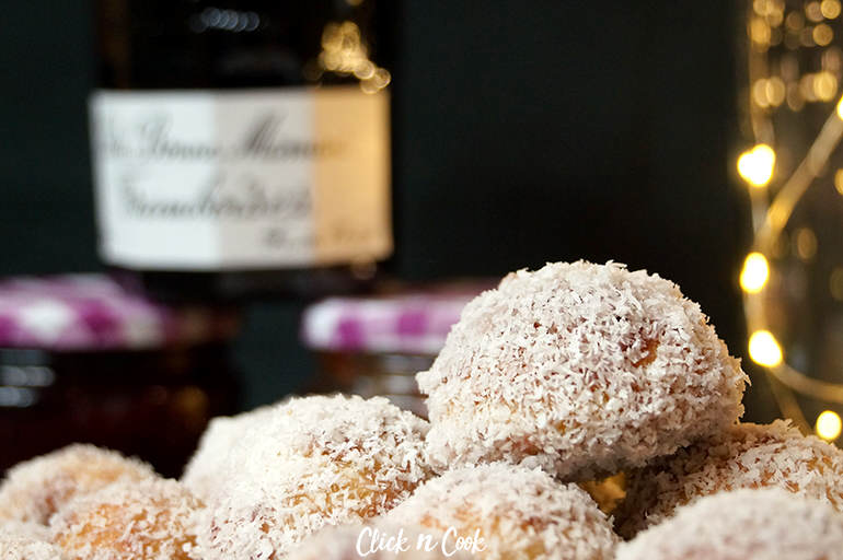 - Roulez les boules dans la confiture puis dans la noix de coco préalablement déposée dans une assiette creuse.