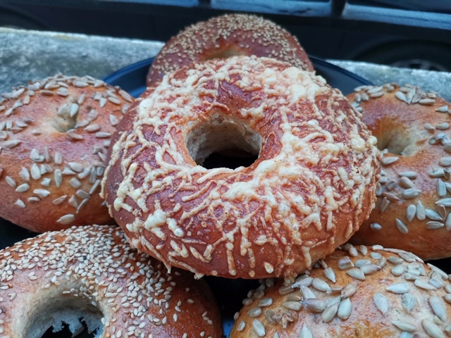 Outre du pain, j’ai commencé à tester quelques autres recettes dont une de muffins anglais au levain qui a été vraiment décevante. Ma recette est bien meilleure, mais je n’ai pas dit mon dernier mot, j’aimerais bien en trouver une à base de levain. Mais la plus belle réussite de ces derniers jours est une recette de pains à bagel. Ils étaient pour le coup bien meilleurs que ceux que je prépare habituellement. Ils étaient bien gonflés, très moelleux, bien dorés… bref, à refaire avec plaisir. La recette vient de mon livre “Le Larousse du Pain” d’Eric Kayser.  J’ai juste fait quelques changements au moment de la cuisson : j’ai ajouté du bicarbonate alimentaire pour le pochage des bagels et j’ai poché que pendant environ 10 secondes les bagels. Ensuite, après les avoir dorés à l’œuf, j’ai saupoudré de gruyère râpé une partie, de graines de tournesol une seconde partie et de sésame la dernière partie.