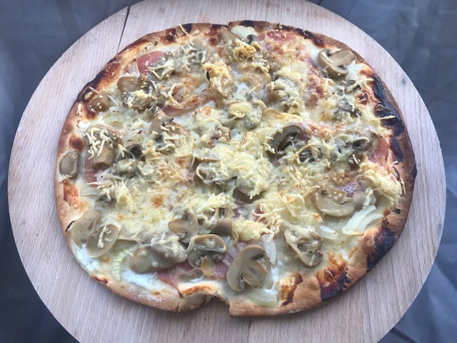 Sur la photo ci-dessus, j’ai réalisé une pizza avec une pâte à pizza du commerce. J’ai déposé dessus de la crème fraîche épaisse, des oignons, des champignons émincée en boite, du jambon et du gruyère. On voit bien que la pâte est parfaitement cuite, elle est croustillante sur les bords et la garniture reste moelleuse. Tout simple et très bon ! Quand je fais ma pâte maison, les pizzas sont souvent plus épaisses et donc plus moelleuses mais toujours bien cuites avec la pierre à pizza.